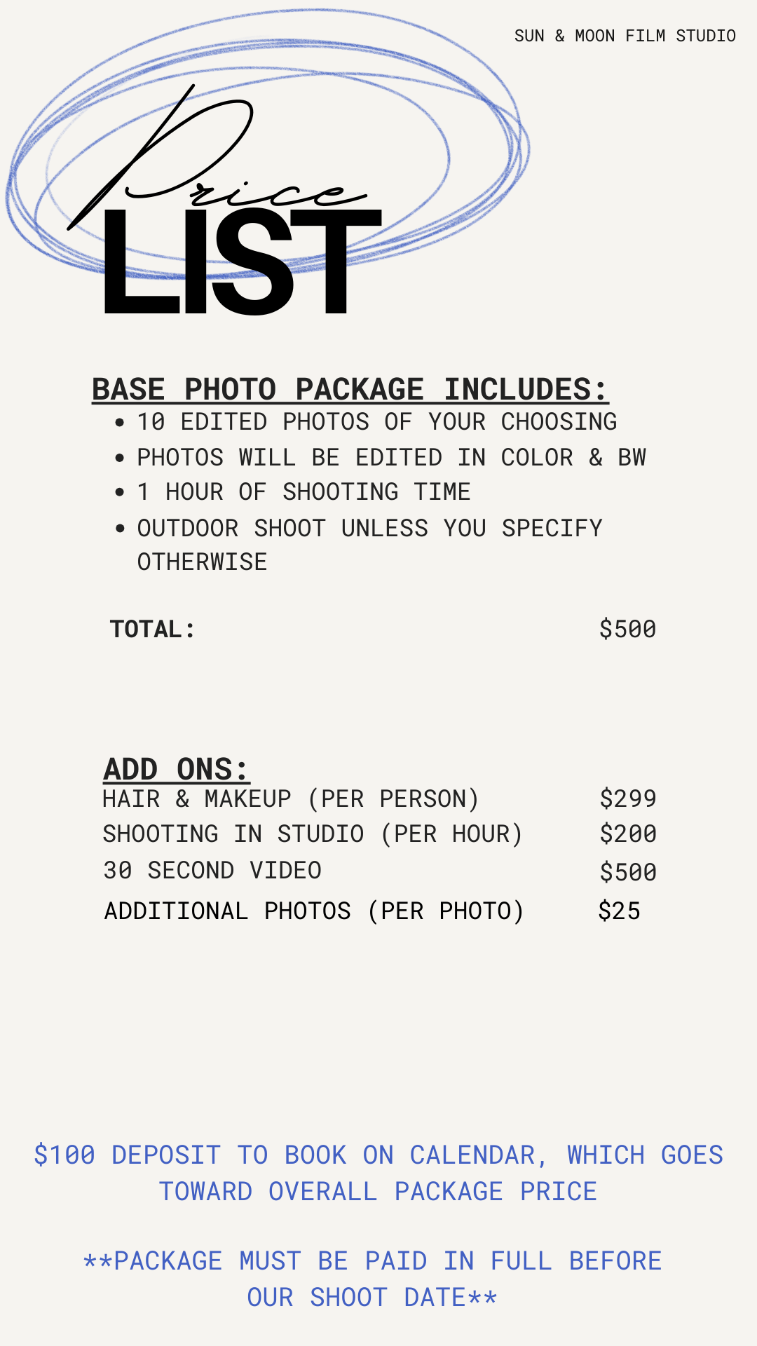 The “add ons” section of the menu is for those that want more of our typical experience — you will need to let me know during our consultation call if you are wanting hair & makeup, studio time or a video montage added so I can prepare accordingly :)